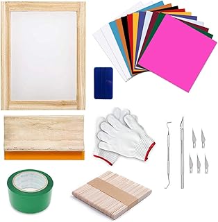Runaup Kit de sérigraphie en vinyle, comprend un cadre pour sérigraphie, 10 feuilles adhésives en vinyle, 2 rubans de transfert pour vinyle et autres accessoires.
